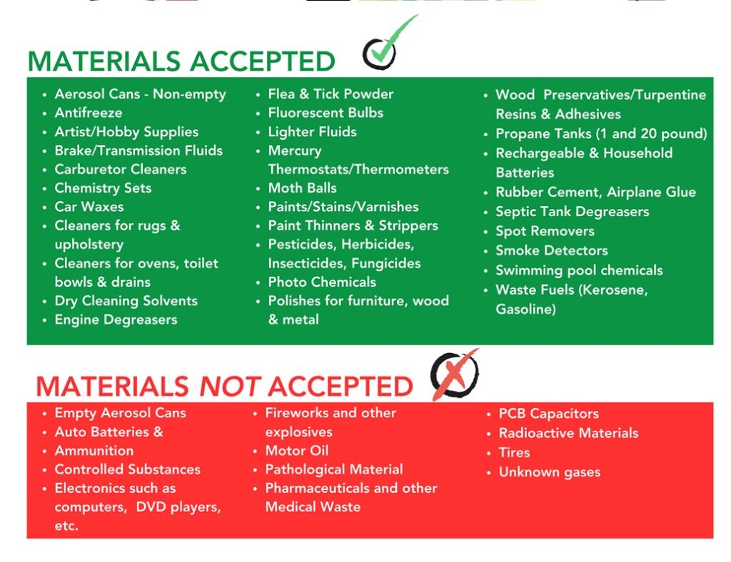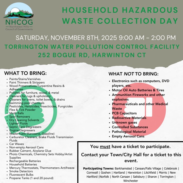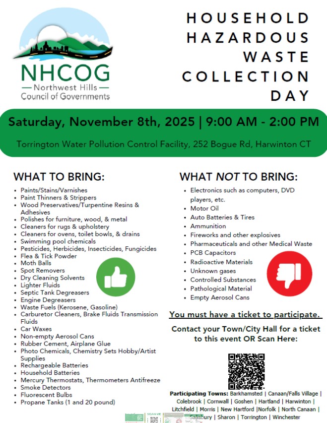 The Northwest Hills Council of Governments (NWCOG) sponsors a Household Hazardous Waste Collection day each fall that Regional Refuse Disposal District # 1 participates it. The event is held off-site from RRDD1 and a ticket for the event is required with prior registration. The ticket is free as there is not expense to the resident. The cost of the annual Household Hazardous Waste event is paid for by the District. As we pay a per car fee, we ask that you partner up with your neighbors when bringing HHW material to the event.